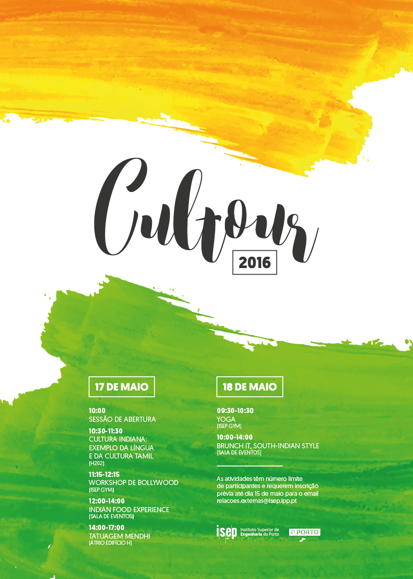 Nos próximos dias 17 e 18 de maio, a cultura indiana estará mais perto da nossa comunidade. Inserida no âmbito da internacionalização do ISEP, a CULTOUR 2016 é dedicada a uma cultura milenar, que tendo recebido influências ocidentais e orientais, surge como uma cultura complexa e rica nas suas diferentes dimensões como a língua, a música, as tradições e a gastronomia.